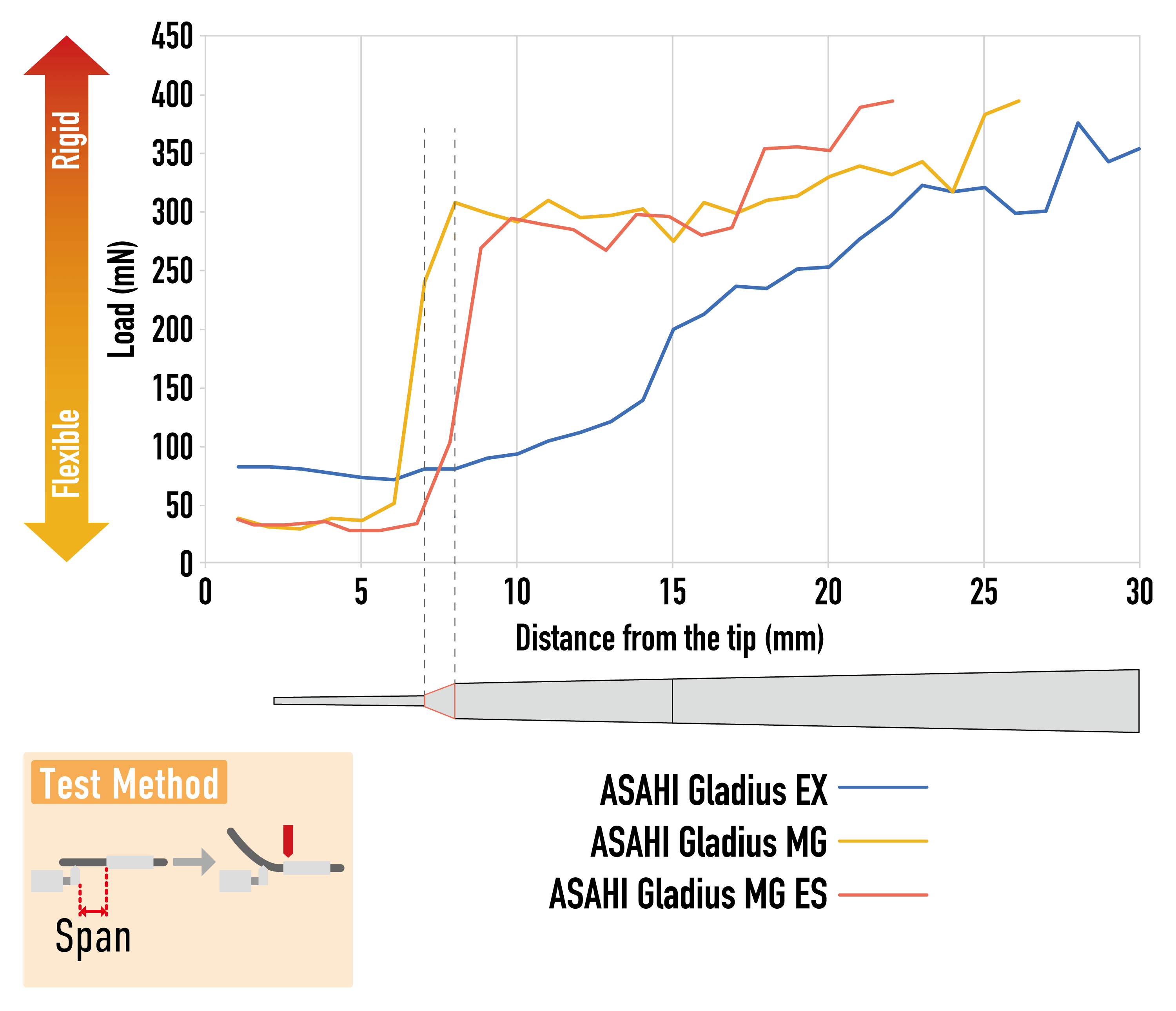 Gladius MG has a modified distal core balance that minimizes a prolapse occurring in the tip.
