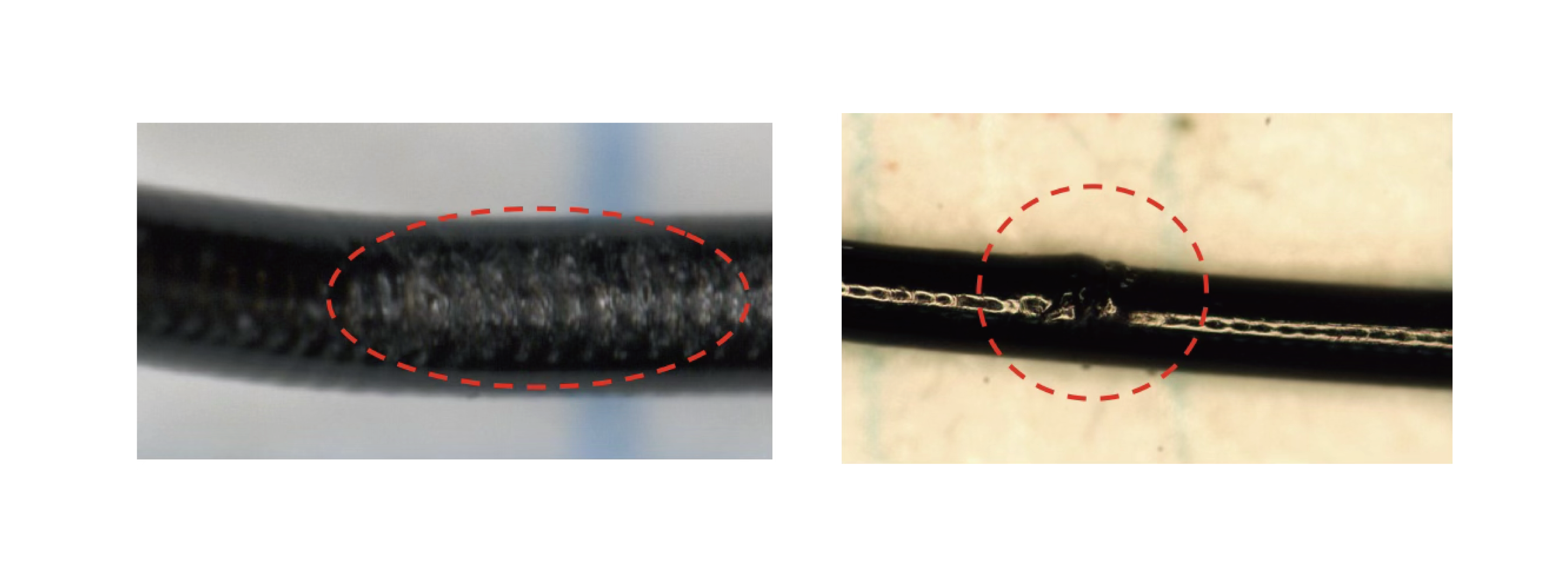 過度な屈曲下での使用下の引き込み時のポリマージャケットの剥がれ