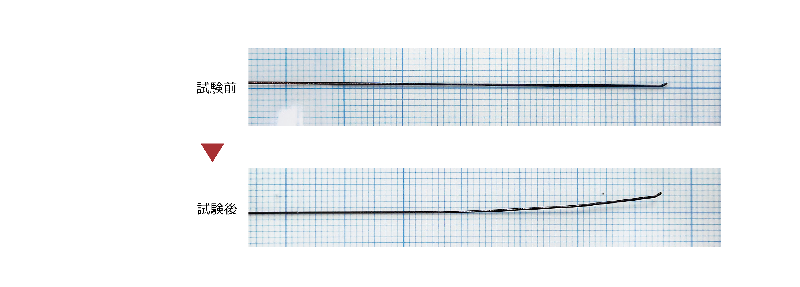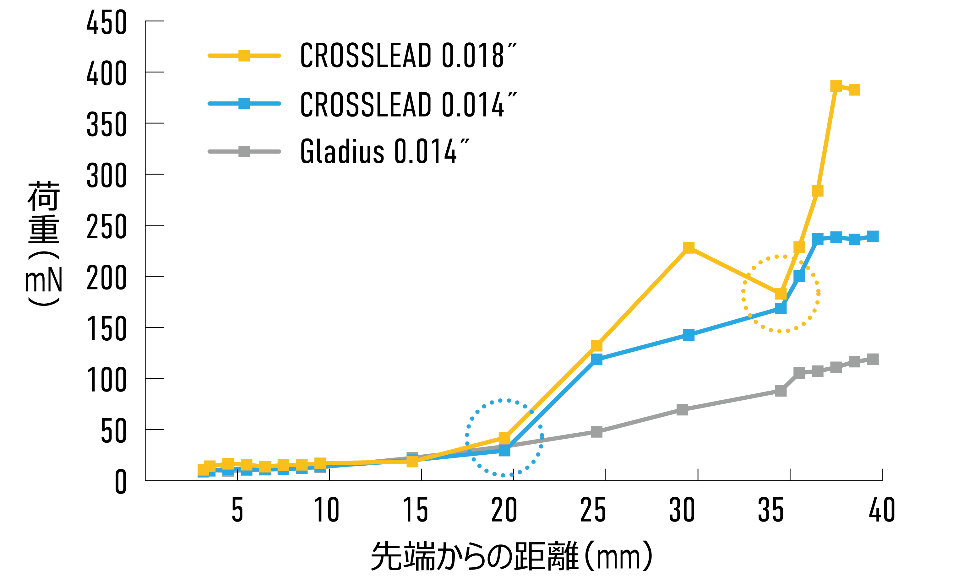 ・当社ガイドワイヤーのTip loadの値は、社内標準テストをもとにガイドワイヤー先端が病変を押す力を想定した値です。実際の製品の値には個体差があります。