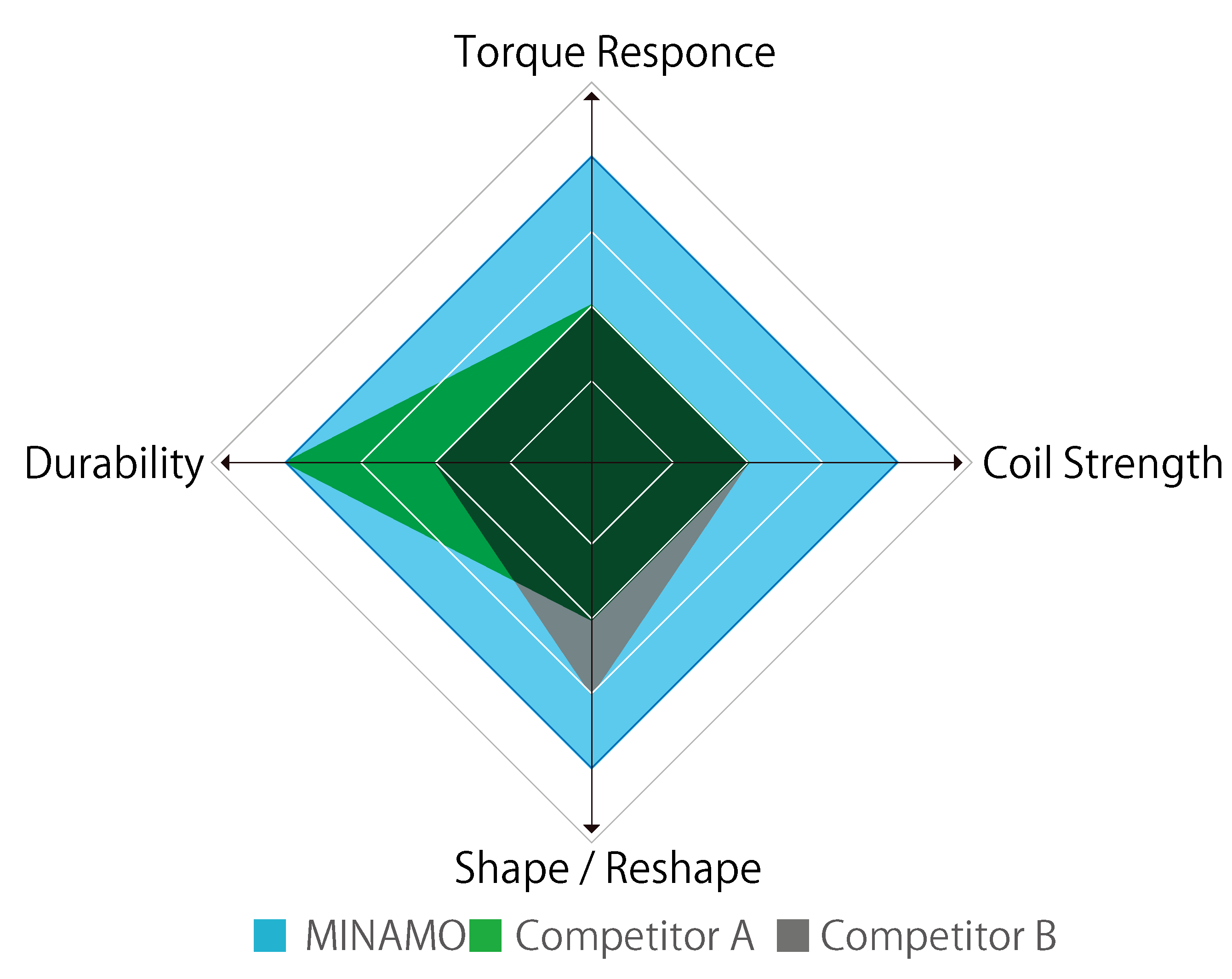 MINAMO: Ni-Ti Core at the tip exhibits quick initial response to the tip and excellent controllability by the SUS Round Press Core and ACT ONE.